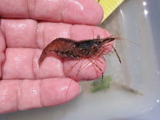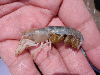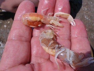 以前はニホンスナモグリが多くみられたが、減ってきて、アナジャコが増えてきてるようである。(アナジャコははさみ脚でなくて、とげになっているところが違う。)何が原因か、釣りの餌として取っているためか、エアホースで本体を舞い上がらせて、それをタモですくうという採り方で、とっているという。