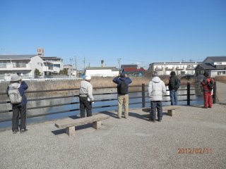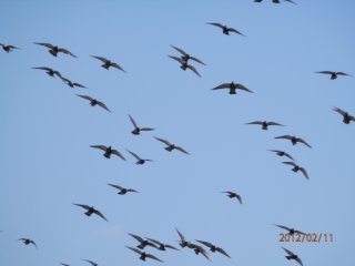 野鳥観察の際の注意事項が神野氏より説明されました。大声を出したり走り回ったりしないことと双眼鏡で太陽を見ないことなどでした。すぐそばの田んぼにはケリがいました。馬池は面積が小さいのにたくさんの鳥たちがいたので近くからじっくりと観察できました。馬池から奥の池へ向かう途中の田んぼに鳩の大群がいてあちこちに移動をくりかえしていました。上空にはオオタカやノスリも観察できたので鳩ものんびりしておれなかったものと思いました。鳩の群れの中に一羽だけ白い鳩がいてよく目立ちました。奥の池も数羽の冬鳥が観察されましたが、馬池にいたものと違う種類の野鳥は見つかりませんでした。地域文化センターに戻って解散しました。(記・大野 )