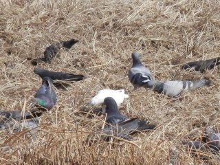 【左】観察風景             【中】ドバトの群れ             【右】白いハトが1羽