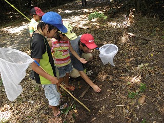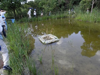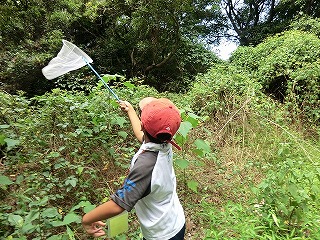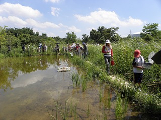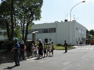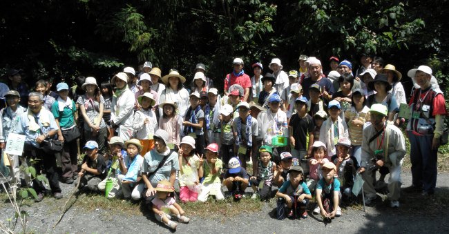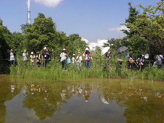 朝から太陽はぎらぎら、元気なちびっ子達と保護者達が集まりました。3階講堂で簡単な事業内容と工場内のビオトープとグリーンベルトなどの説明がありました。知多自然観察会会員の紹介の後10班に分かれてビオトープとグリーンベルトの観察に向かいました。ビオトープの観察は今年が最初です。ビオトープは池というよりは水田に多めに水を入れたような状態でした。水面を色々なトンボが飛び交い、水中にはゲンゴロウと小さなメダカかカダヤシか判定できない魚が泳いでいました。池の周りはアシ、クズ、ノイバラ、ピラカンサなどが観察できました。暑いので木陰が恋しくなったのでグリーンベルトに移動しました。木陰に入って一休みして森の中を観察しました。森の中には腐葉土がたくさんあってカブトムシなど沢山いるものと期待しましたが、私のグループでは確認できませんでした。森の入口にはよく茂ったハンテンボクの木があってたくさんの蕾がついていたのを見て開花すればきっと素晴らしいだろうと想像しました。森の入口で記念写真を撮って解散しました。(記・大野)