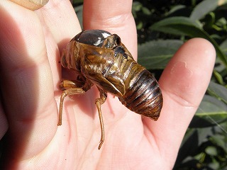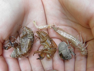 【左】ヒロヘリアオイラガの踊室跡 【中】アブラゼミ、羽化失敗 【右】セミ抜け殻、左からクマゼミ、アブラゼミ、ニイニイゼミ、ヤンマの抜け殻