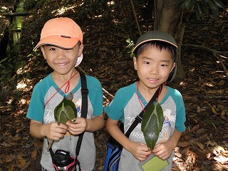 【左】水田風ビオトープ? 【中】二人で葉っぱぞうり一足 【右】お父さんちょうだい