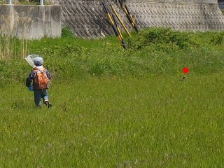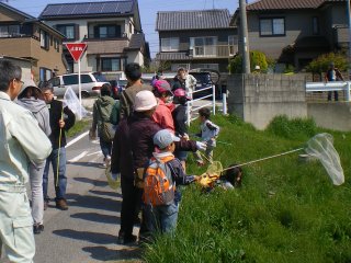 好天に恵まれ暖かいので、色々なチョウや鳥が舞い飛び、すばらしい観察会日和である。子供達はタモでチョウを捕まえてご機嫌。しかし、お母さんの「家では飼えないから・・・」と言う声かけに、帰りには優しく放していた。ケリを捕まえようと田んぼの中を元気に追いかける子を、ケリがからかっているのか、近づく度に逃げて、ほほえましい光景だった。稲荷神社では「生きた化石」であり、「天然記念物」のマメナシが綺麗に咲いていた。観察会が終わり、子供達に感想を聞くと、「楽しかった!」と口々に答えていた。(記:吉房)