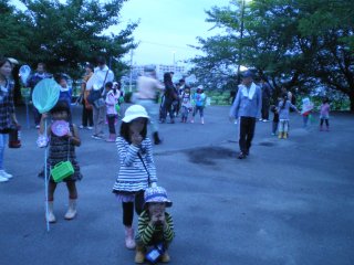 蒸し暑い夏日の夕方、元気な子供達と保護者の皆さんが旭公園に集合しました。タモ、虫籠、懐中電灯を持ってやる気満々です。 開会の挨拶と諸注意の後、園内の虫とりポイントに向かいました。すでに親子の先客がおられて虫籠のコクワガタを観察させてもらった後、コクワガタのいるコナラのうろを教えて戴きました。しかし残念なことに子供達には見えない高さで何とか見せようと保護者の方の協力を得て代りばんこに抱え上げました。コクワガタは強力なライトと騒がしさに驚いたか少しずつ奥へ逃げ込み、捕えられませんでした。
