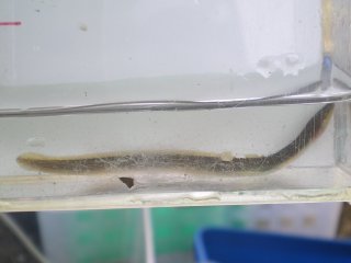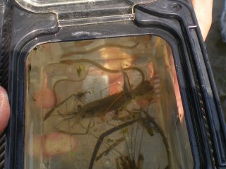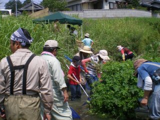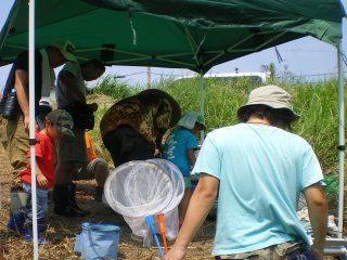 雨の予報も悲喜こもごもの肩すかし、真夏日は今日も保証付き。河原に新品のタープを張って生き物の展示と説明の場所を確保しました。元気な少年少女達はやる気満々で、川に入りました。一度水に入れば暑さも忘れひたすら獲物を求めてジャブジャブ、ガサガサ。「とった、捕った」「でっかいテナガエビだ」「ウナギだ」と盛り上がりました。早めに川から上がり、お子様優先でタープの下で捕った生き物を紹介した後、皆で川に返しました。小さなお子さんもいて心配しましたが保護者の方の協力もあって無事に観察会を終了できました。(記 大野)