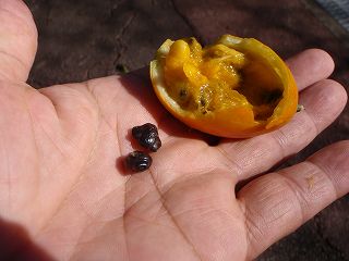 【左】よく見ると不思議がいっぱいある  【中】カラスウリとその種(たね)  【右】シイの実