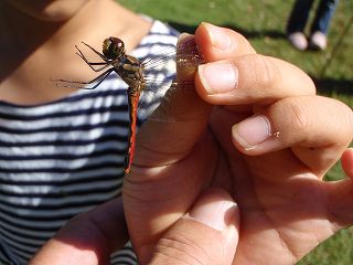 【左】始めのあいさつ。アサギマダラは飛んでるかな…  【右】赤とんぼつかまえた…(^o^)/