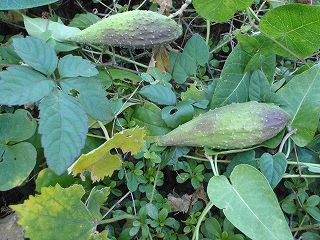 【左】ガガイモの実   【中】赤とんぼ(アキアカネ?)  【右】ホタルガ