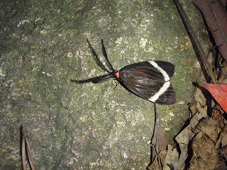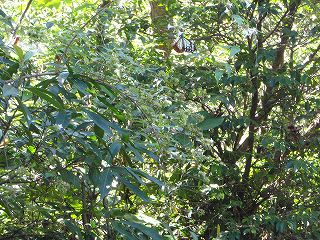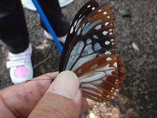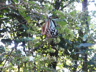 アサギマダラが見られない場合は参加者の期待を裏切ることになり誇大表示になりかねないタイトルである。結論から言えば十分OKの観察会であった。アサギマダラそのものは3匹しかいなかったが、その内の1匹は一番欲しがっていた人が網を出したら飛び込んできた。「これで実物をよく見て版画ができる…」と本人は大喜び。また、1匹は花の蜜を吸うのに一生懸命で私たちが近づいても離れずにいたので近くで長く観察することが出来た。