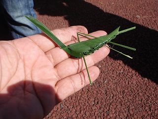 【左・中】シュロの葉で“バッタ”づくり→完成   【右】アサギマダラ…ど〜こだ