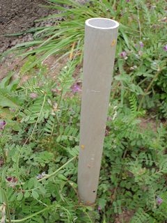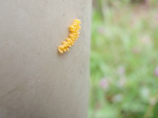【左】土手にささった塩ビ管に黄色のタマゴ 【中】同左の拡大…何のタマゴかは? 【右】ヒメウズの群落があった
