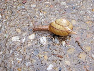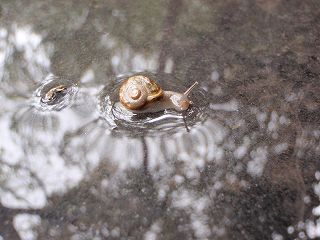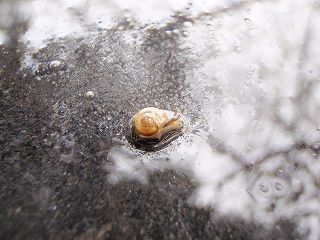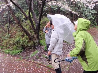 桜は花見に最適な状況。ヒラドツツジは未開花。タンポポは雨水で閉じている。テントウムシも少なめ…。蝶は飛んでいない。ただし、カタツムリには出会った。また、ヒヨメ(カイツムリ)の鳴き声やヒメクイナの鳴き声が9:40ごろにしっかり聞こえた。特にヒメクイナは素人でもはっきり判る大きな声で2〜3分は鳴いていた。これは鳥マニア氏の解説によると“めったにないすごい体験”とのことでした。
