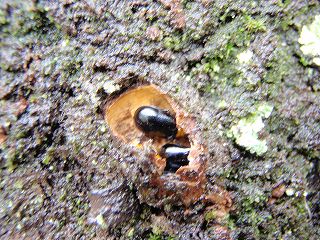 【左】イラガのサナギが入っているマユと確信して開けたらクロウリハムシが3匹