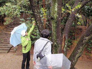 【左】イラガのサナギが入っているマユがないか探している 【右】ヤマガラが桜の花をついばんでいるところを見ている
