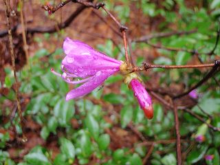 【右】コバノミツバツツジの開花日。昨日の下見時には咲いていなかった。
