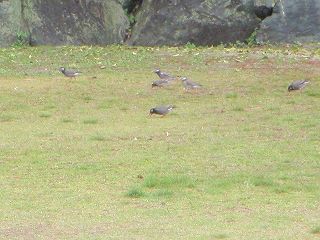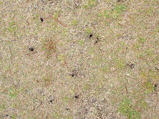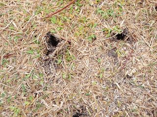 【左】ムクドリが集団で地面を突っついている 【中】ムクドリが突っついた穴 【右】同左の拡大