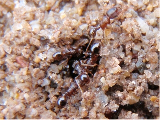 【上】アリが巣を出入りしている。3mm前後のアリで