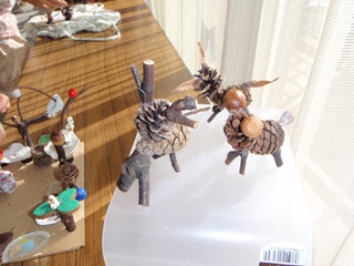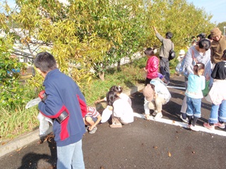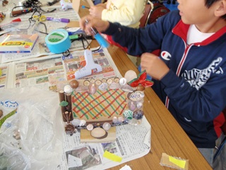 環境課の担当職員がセンター内で事前に拾い集めたものが工作会場に並べてありましたが、参加者も自然観察がてらの材料探しに出かけました。