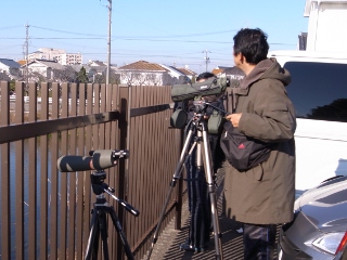 【左】康衛池 この日はカモの数が少なかったようです。 【右】りっぱな望遠鏡持参で参加してくれました。