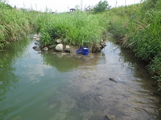 本日の観察地点は稗田川と平地川の合流点で、しかも、ゆるやかな階段が両岸に設置されていて川に入れる市内でも数少ない親水場所です。川岸には公園がありいざというときにも便利な場所です。