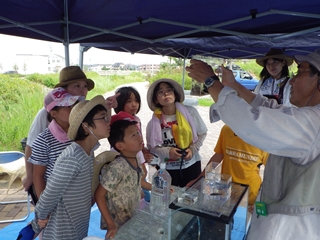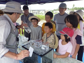 環境課がセットしたテントの下で挨拶と諸注意の後、早速、川に入って採集活動。フナ、ドジョウ、タモロコ、トウヨシノボリなども採れましたが、ほとんどはカダヤシと子どものアメリカザリガニでした。言うなればカダヤシとアメリカザリガニの宝庫といった感じでした。そのためかどの子にも網でつかまえることができ、良い体験になったと思います。