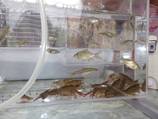 【右】フナ、カダヤシ、タモロコ、アメリカザリガニが見える。他にエビ(3種類)、ドジョウなどもいる…