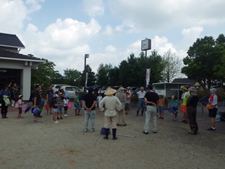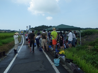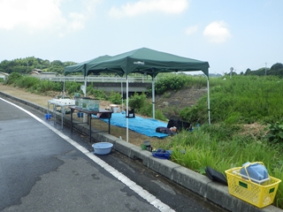 修農公民館から川への降り口までは約450メートル。暑い中を歩くが、期待が胸にあるのでへっちゃらです。降り口には主催者(環境課職員)がセットしたテントなどが設置され(掲載写真参照)参加者を待っていました。降り口付近のきれいに刈り込まれた土手も主催者が数日前にやったとのことです。