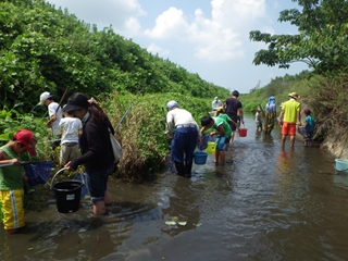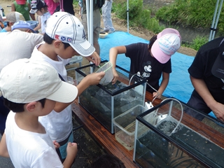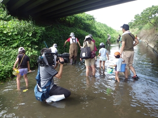 さっそく、川に入り、採集活動、40分ぐらい。初心者の参加者にはベテランの指導員が採り方のお手本を見せていました。