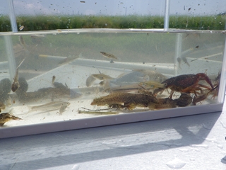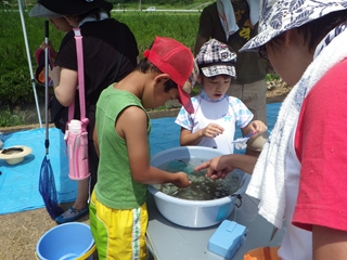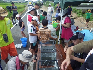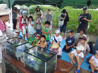 11:20ごろには主催者の終わりのあいさつがありましたが、その後、つかまえた生きものとの“ふれあいタイム”を設けたので、結局、片付けも終わったのは12:00過ぎていました。しかし、ホントに、子どもたちが触りながら歓声をあげているのを聞くたびに、“本物に触れあうことの大切さ”を感じています。     以上 (記:榊原正)