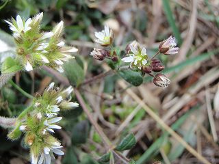 小道(午後からは日陰になる場所)で、ミミナグサが見つかりました。とても少なくなっているそうです。(ミミナグサはオランダミミナグサに比べて、がくや花茎の赤茶色が濃い)