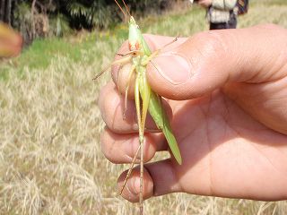 田んぼも道端もなじみの春の野草が多く見られました。チガヤの草原では見事なスミレがあちこちに見られ、成虫で越冬するクビキリギス(緑色と褐色)、コモチグモなどクモ多数が見られました。暖かいのに、菜の花やレンゲにミツバチがいないのが気になりました。