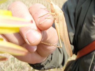 【左】クビキリギス(緑色型)…成虫越冬  【中】同左(褐色型)  【右】アケビの花
