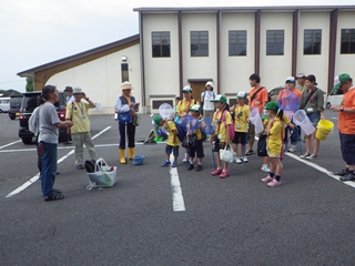 【左】集合場所の駐車場で始めのお話 【右】丸いタモ網は頭をまっすぐにすることを教えてもらう