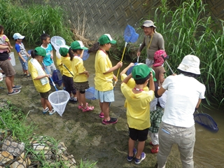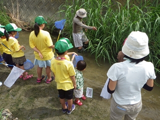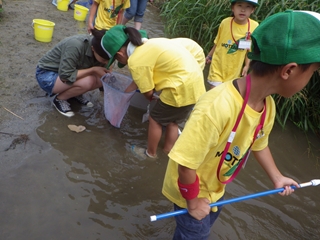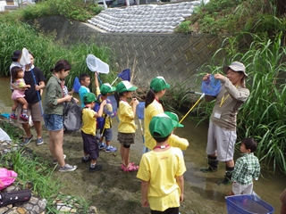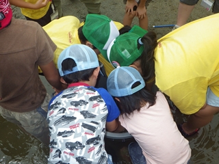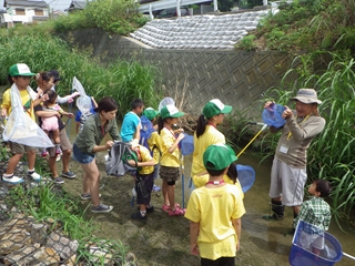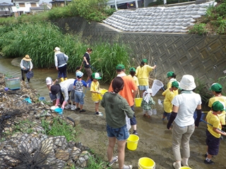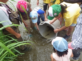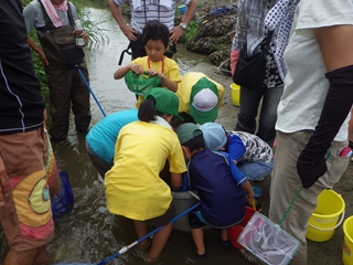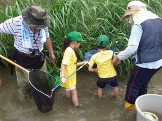 朝から雨模様で、ひょっとするとできないのではないかと心配したが、雨が上がり、イオンのグループの参加もあってにぎやかだった。前日からの雨の影響がなくて水量は少なかったので、小さなお子さんにも楽しんでもらえた。足で網に追い込むようにするとよく入るよのアドバイスにみんなががんばった。