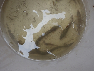 食べごろサイズのウナギに驚き、ぬるぬるのウナギをさわって歓声を上げた。大きめのフナとコイのが採れ、その違いやライギョの模様などいろいろな魚を比べて楽しんだ。フナがたくさんいた。(記・岩本)