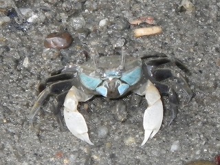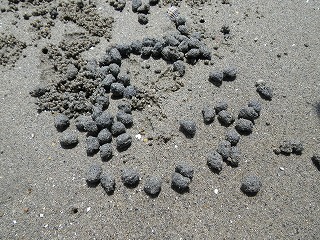 【左】コメツキガニの食後の食べかす(砂団子) 【中】コメツキガニ (素早いのでつまんで撮影) 【右】模様の綺麗なタイワンガザミ