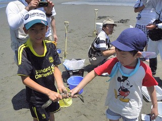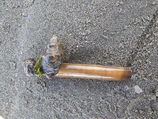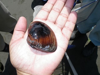 【左】ハマグリ 【中】シオフキの砂もぐり観察 【右】細長いマテガイに付くイボニシ