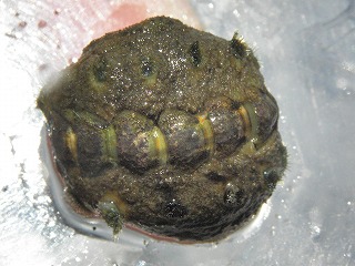 【左】ユビナガホンヤドカリ (宿貝:イシダタミ) 【中】ユビナガホンヤドカリ (宿貝:イボキサゴ) 【右】ユビナガホンヤドカリ (宿貝:アラムシロ)