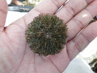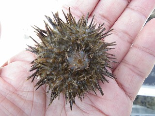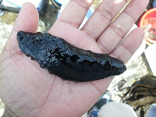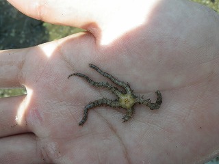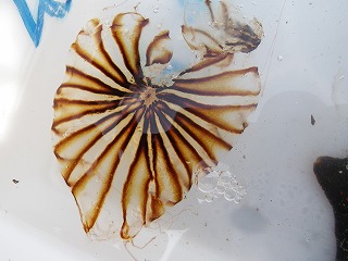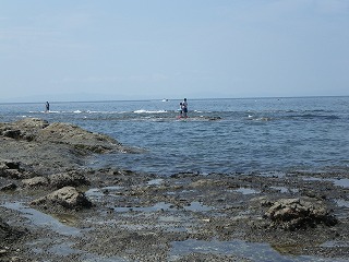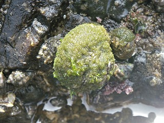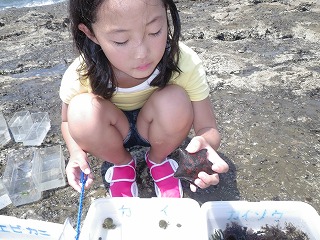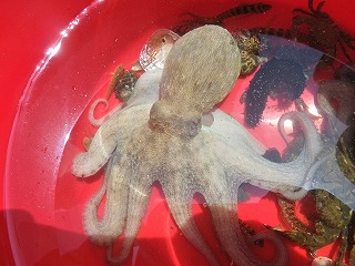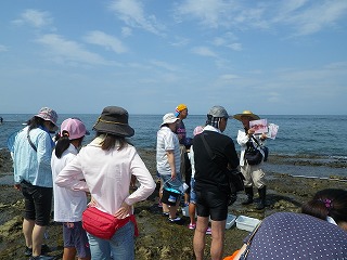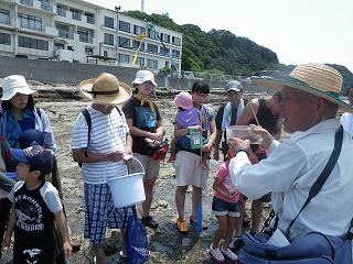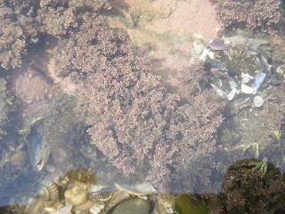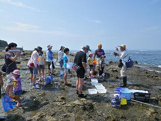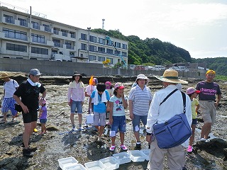 磯の広い岩場に集まって、危険な生きものについての注意、採集後の生きもののリリース、子供の事故防止についてお願いして、早速生きもの観察と採集に取りかかりました。スタッフは事前に魚類等の採集成果を水槽に入れて展示するとともに、観察途中での質疑応答、採集方法の指南、子ども達への目配り、記録撮影等で忙しい時を過ごしました。参加した親子はたも網の中の小魚やイシガニ、ヤドカリに歓声をあげていました。当日は沢山の種類の小魚、中くらいのタコ2匹、大きなイシガニに話題が集まりました。あまり話題にはなりませんでしたが、磯だまりに繁茂する海藻のキョウノヒモが印象に残りました。