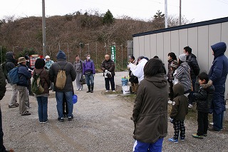 【左】長谷崎の駐車場で開会式      【右】現地に移動