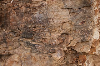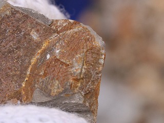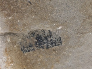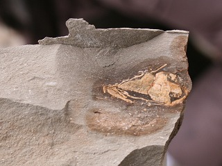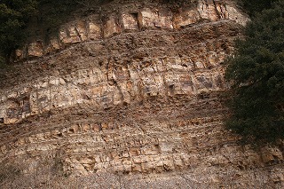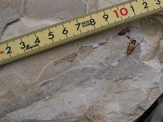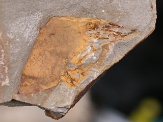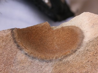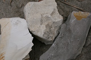【左】化石が入った岩石        【中】火山灰を含んだ岩石(左)、砂岩(中)、化石を含んだ砂泥岩(右)       【右】砂岩の部分が深くなっている
