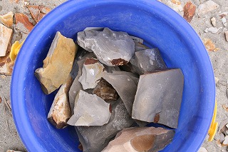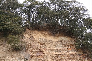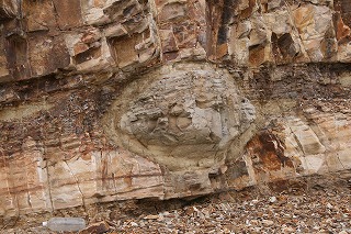 【左】最上部に段丘堆積層がみられ、チャート礫も見られる          【中】ノジュール          【右】地層の崩壊跡