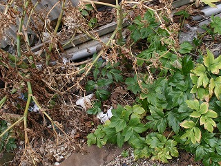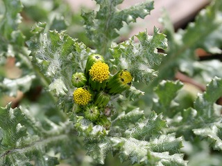 【左】ハマダイコン             【中】ハマウド、左の株は種を付け枯れている            【右】ノボロギク(外来)