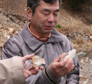 【左】貝の入っている地層説明           【中】化石の取り出し           【右】いいのが出て来たよ