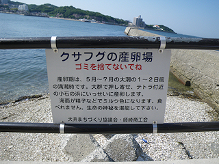 【左】産卵が始まるのを静かに待ちます  【右】港にはまちづくり協議会の作った看板が