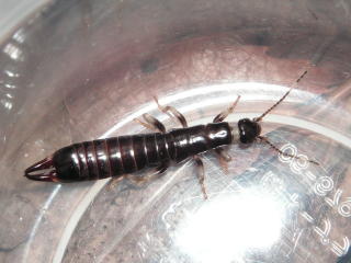 【右】ハサミムシ(別名ハマベハサミムシ、触角は褐色、白斑はなく、肢は一様に橙黄色です)