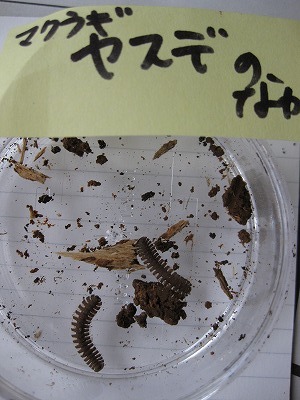 カブトムシの幼虫一匹、コクワガタの幼虫二匹、カミキリムシの幼虫多数、キマワリの幼虫多数、ヤマトシロアリ多数、ヒゲジロハサミムシ、ハサミムシ、 ヒョウタンゴミムシ、ユミアシゴミムシダマシ、ヨツコブゴミムシダマシ、エグリゴミムシダマシ、ウバタマコメツキ、クチキムシ、ウバタマムシ、 マダラマルバヒロズコガ、コガタスズメバチ、サシガメ 、ガのまゆ、オカダンゴムシ、ワラジムシ、ゲジ、マクラギヤスデ、アオズムカデ、ジムカデ、イシムカデ、ミミズ、ナミコギセル、オカチョウジガイ、ベッコウマイマイの仲間、虫は平松さん東海市のメモも参考にしてください。(記・吉川洋)