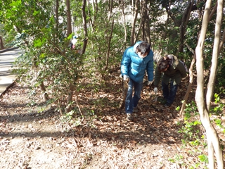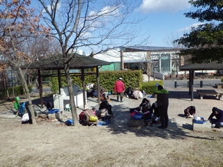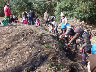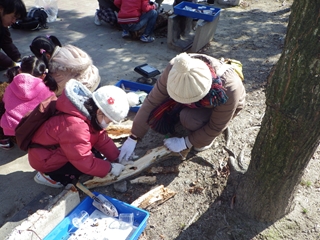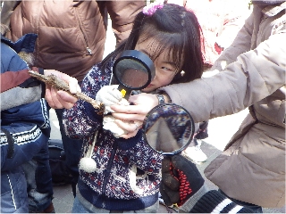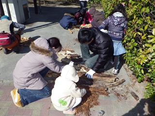 予約済みの家族がそろったので暖かい部屋の中での説明の後、本日のテーマに期待を込めて冷たい風の吹く館外の林の中へ、いざ、出陣…。