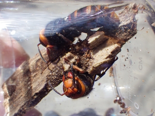 【左】集めた朽ち木を分解して住んでる虫さん探し 【右】出てきたスズメバチの観察(写真にポインター→少し拡大)