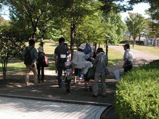 【左】生き物観察に出発です 【右】芝生広場から観察を始めました